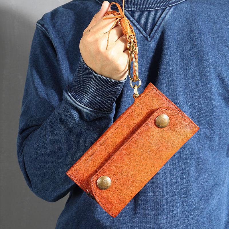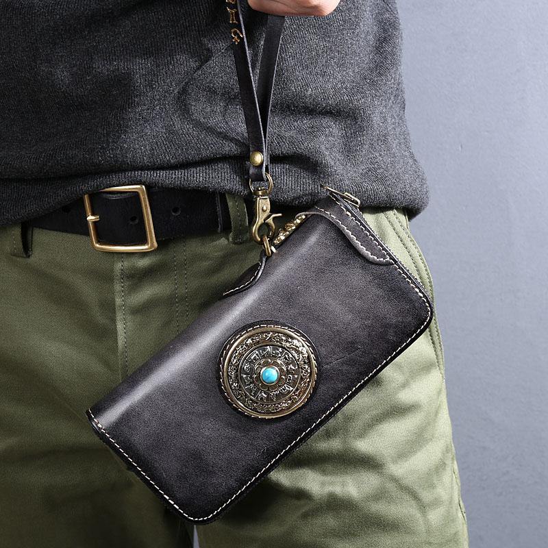 • Leather Mens Cool Vintage Wallet Bifold Long Leather Biker Wallet Black Clutch Wristlet Wallet for Men