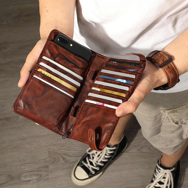 • Handmade Black Leather Mens Bifold Long Wallet Brown Multifunction Wallet Phone Wallet Card Holder Clutch Men