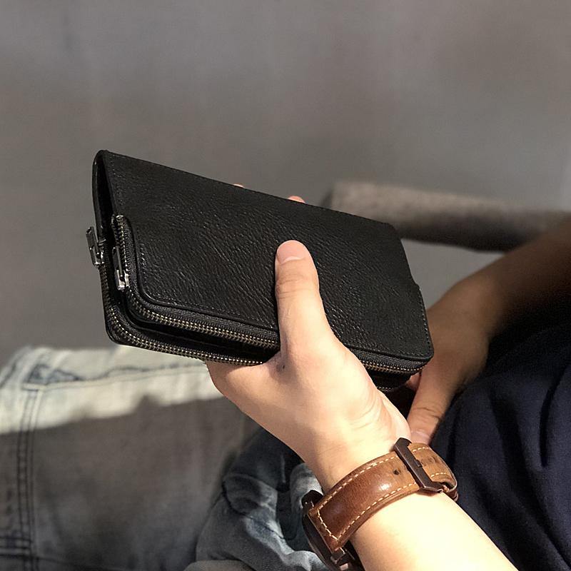 • Cool Black Leather Mens Long Wallets Large Double Zipper Clutch Wallet Coffee Vintage Clutch Purse For Men