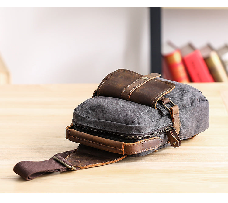 Design: Canvas Leather Mens Gray Chest Bag One Shoulder Backpack Green Sling Bag for Men