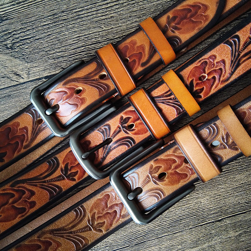 Style: Cool Handmade Embossed Brown Leather Mens Belt Dark Brown Leather Belts for Men