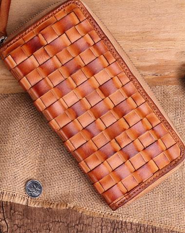 Cool Tan Mens Leather Long Wallet Braided Zipper Long Wallet for Men