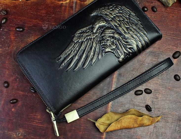 Design: Handmade Leather Mens Tooled Indian Cool Zipper Phone Travel Long Wallet Card Holder Card Slim Clutch Wallets for Men