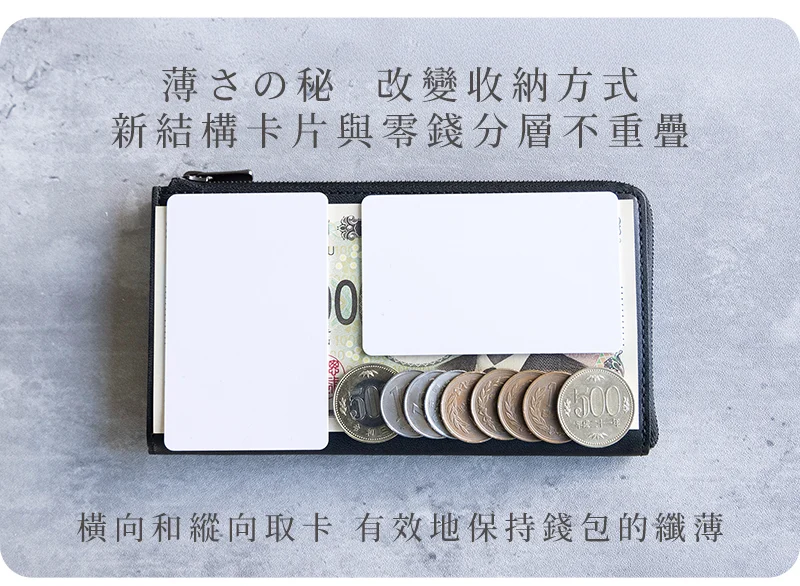 未收納前很薄,放了卡片之後也會變厚。當然,如果確保卡片和硬幣不重疊,也能達到一定的薄度(大約15到20毫米),但還不夠薄,我不太滿意!