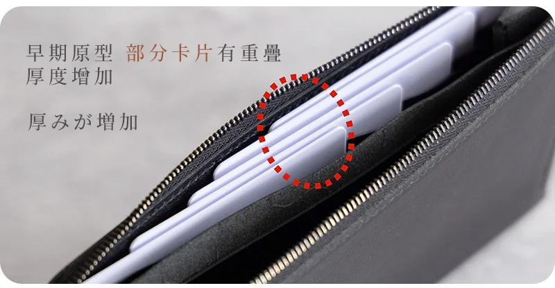 這種卡槽結構最初應用於 il modo 和 il modo ZIP,是將長款錢包設計得盡可能小巧的一項極具創新性的設計,此設計有一個缺點,如上圖紅色橢圓所示:有些地方所有卡片都有重疊