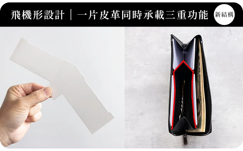 AIR 的新設計,不是多,而是少!一片像飛機狀結構設計,整合了卡夾、零錢層與分隔層。
