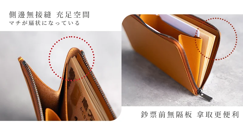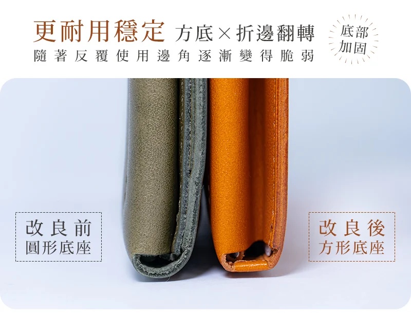 如上圖所示,透過在底部使用稱為「捲邊」的技術,我們能夠加固底部側縫,而不會在錢包的正面或背面留下任何痕跡。同時,這種底部加固結構也解決了另一個問題