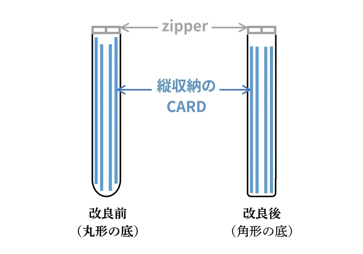 透過在底部側片上添加捲邊,底部的形狀變為方形,從而消除了卡片上的壓力(如上圖右側所示),並大大降低了與拉鍊發生干涉的風險!