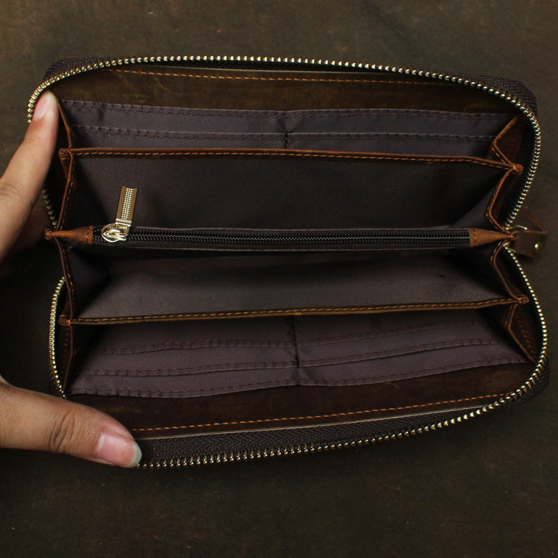 Style: Vintage Braided Brown Leather Men's Clutch Long Wallet Zipper Long Wallet For Men
