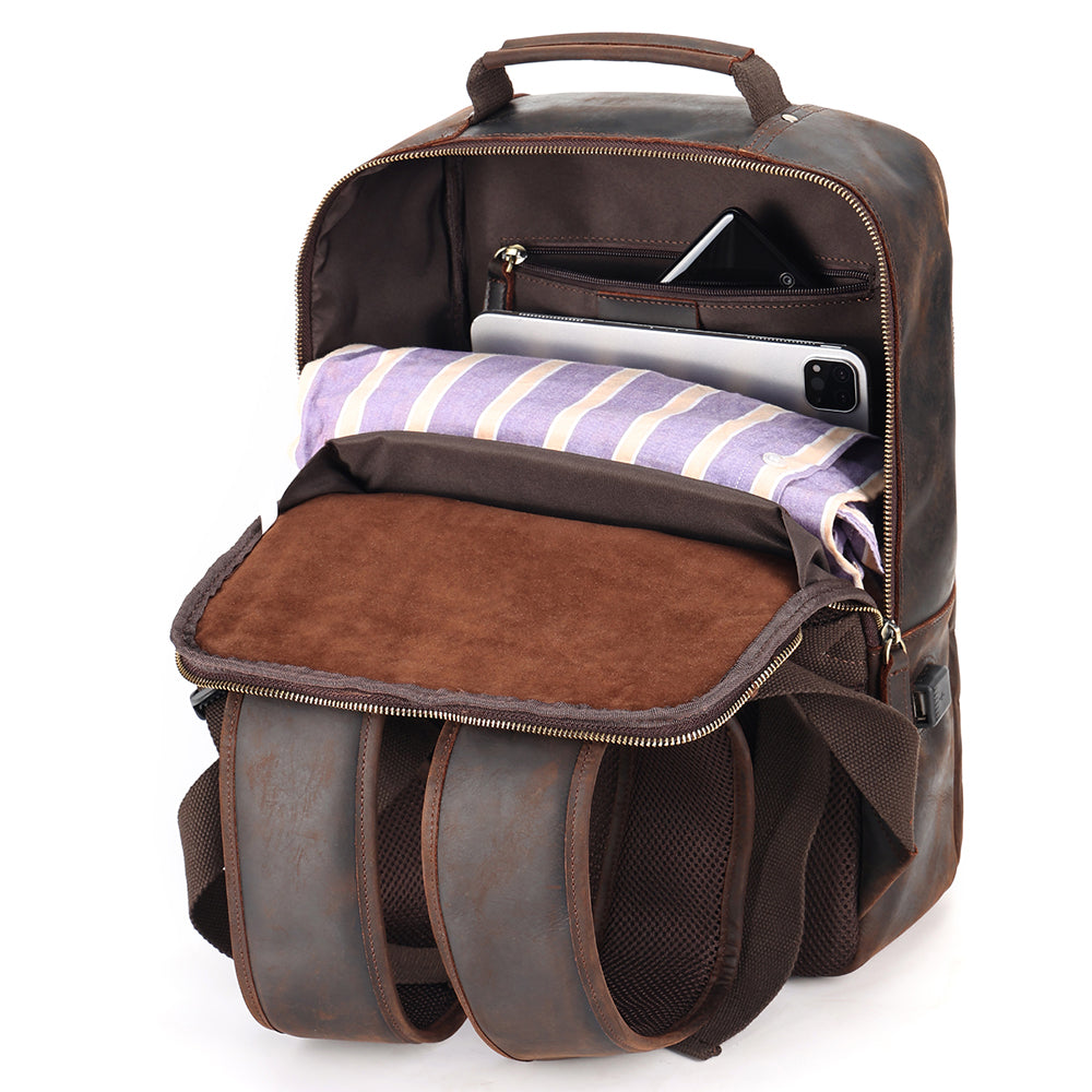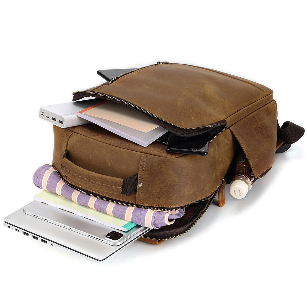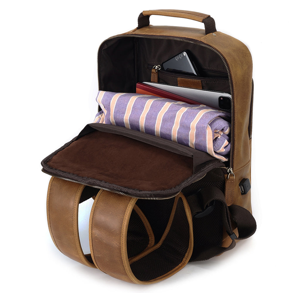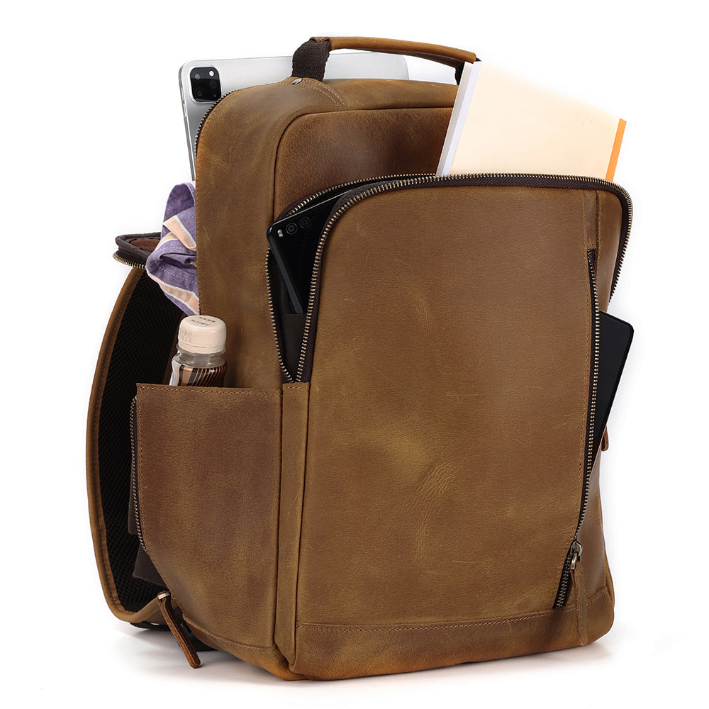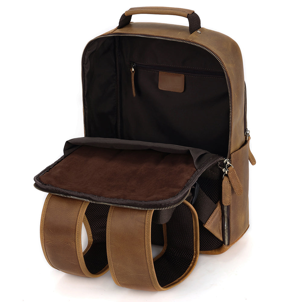 It's a vintage looking backpack due to the quality leather used, but is made thoughtfully with a bunch of storage areas for all your gear. There's a main compartment with three separate areas, and a front compartment with plenty of room for smaller items in their own pockets like cards, pens and a smartphone.