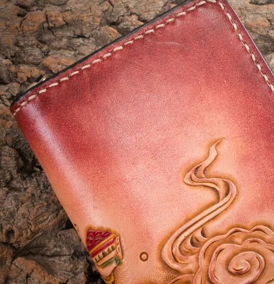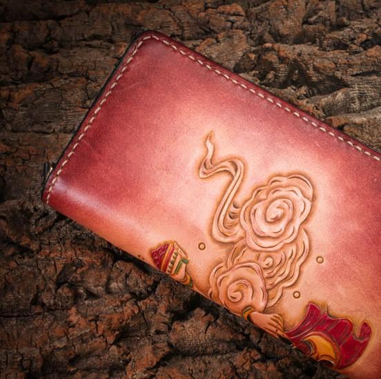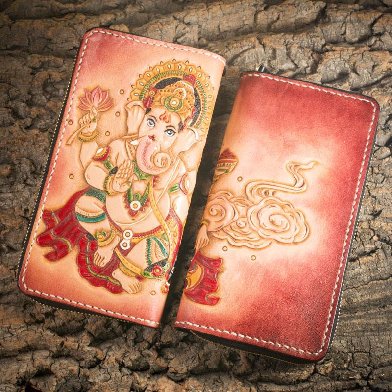 Handmade Leather Mens Clutch Wallet Tooled Cool Ganesha Wallet Long Zipper Wallets for Men