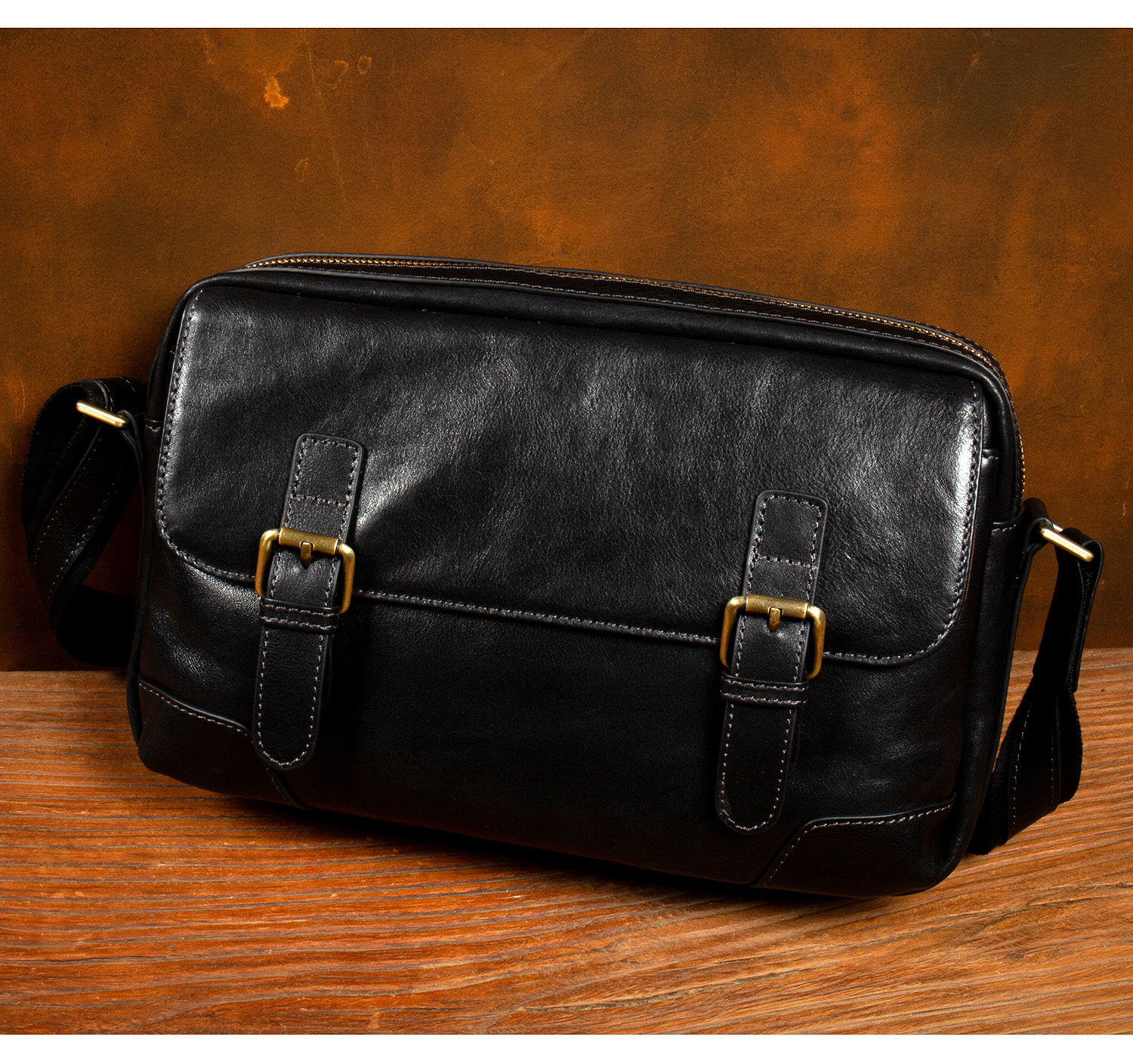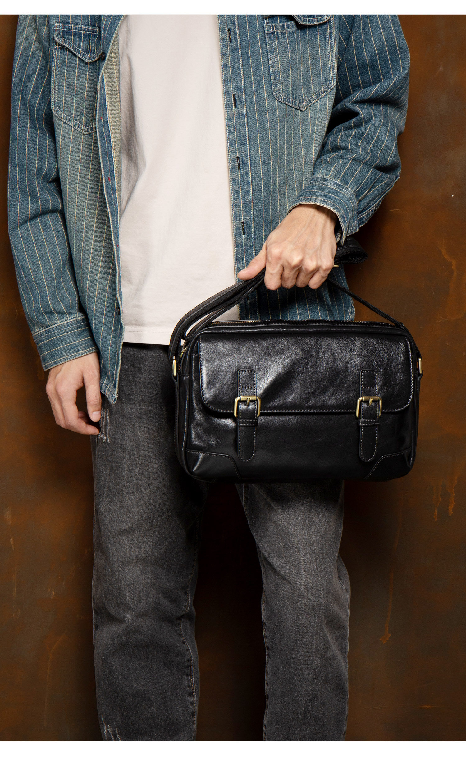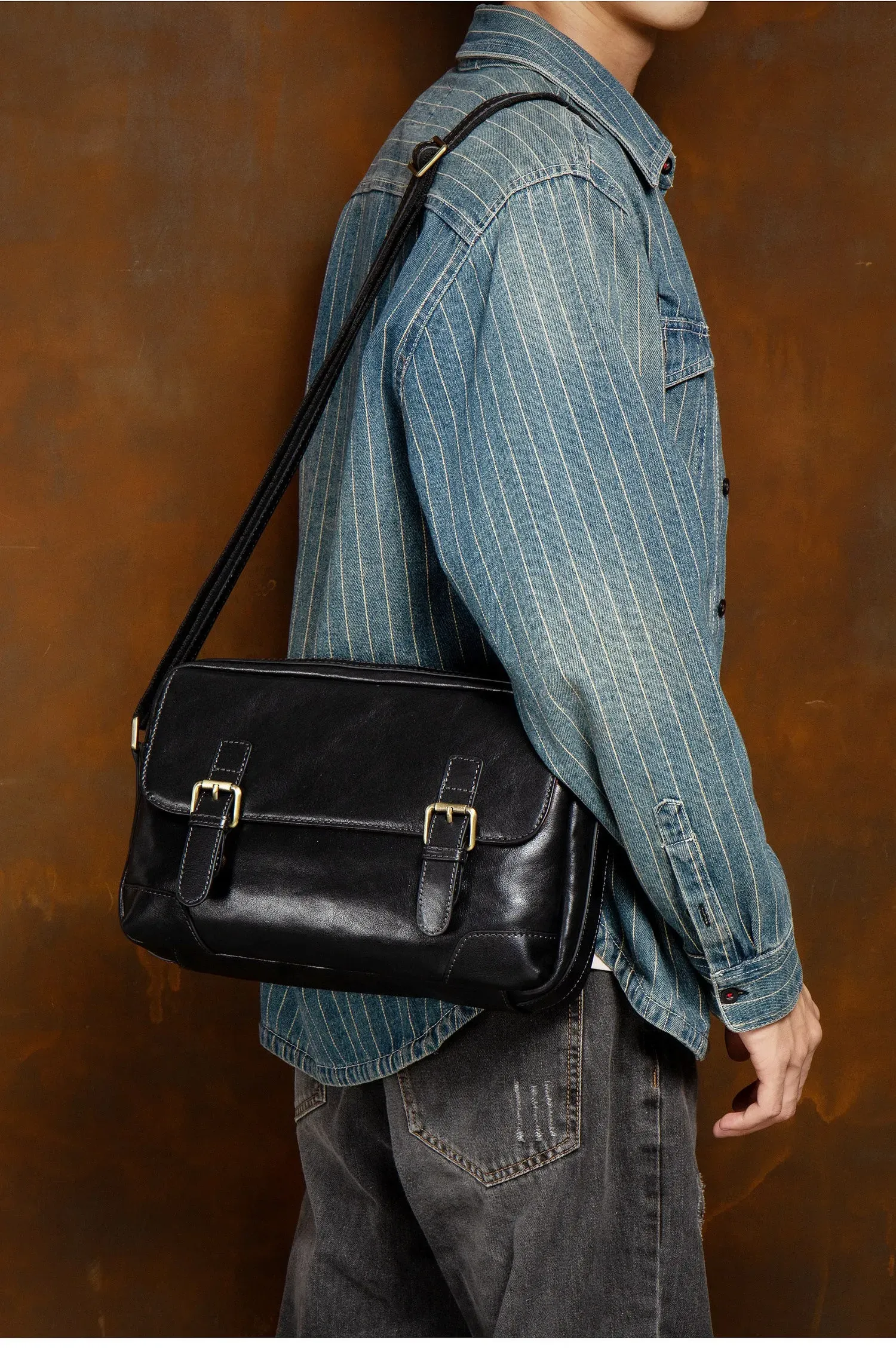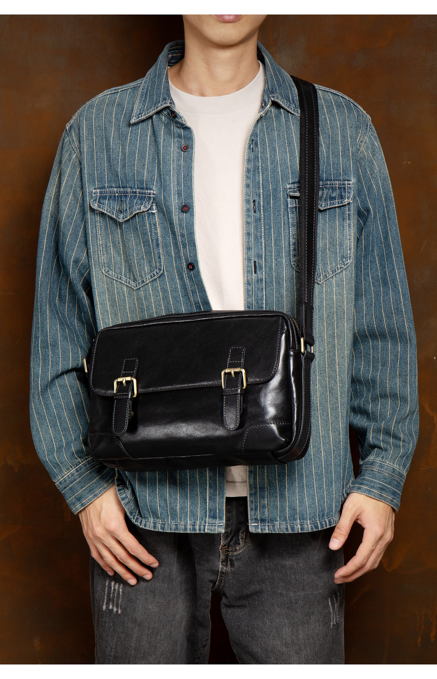 DEEPKEE 男士真皮高級感郵差包 黑色雙扣帶 休閒通勤單肩斜挎包 1368號