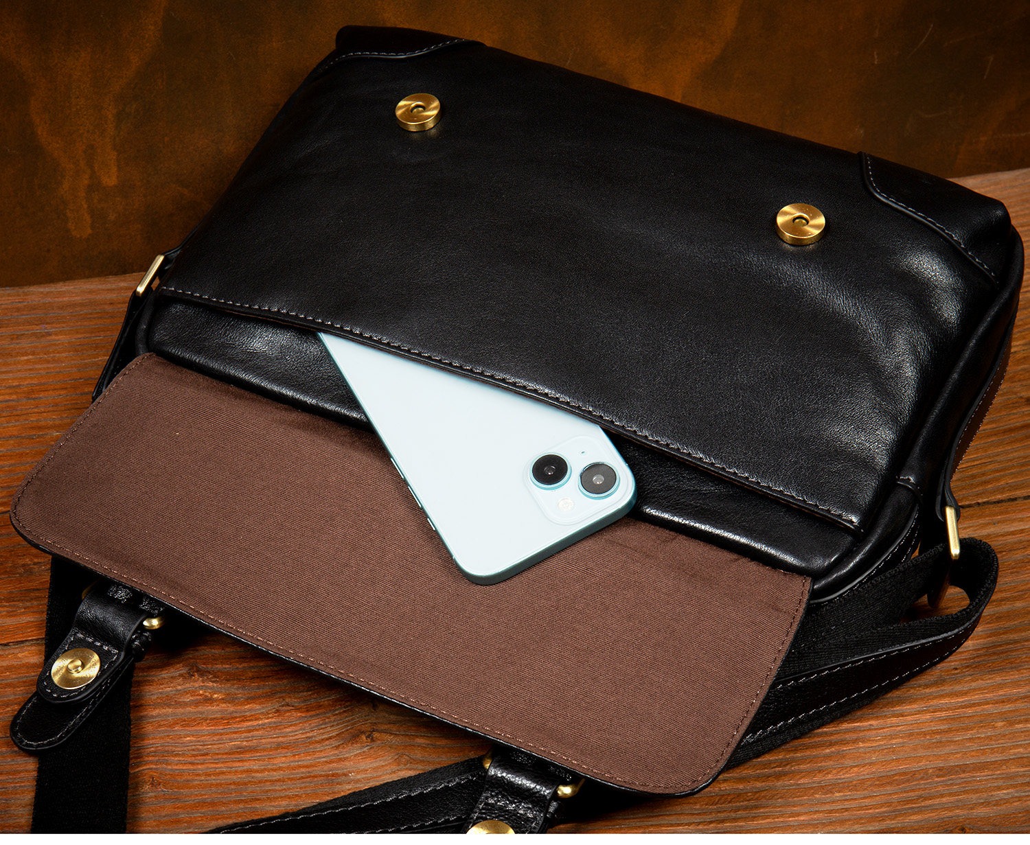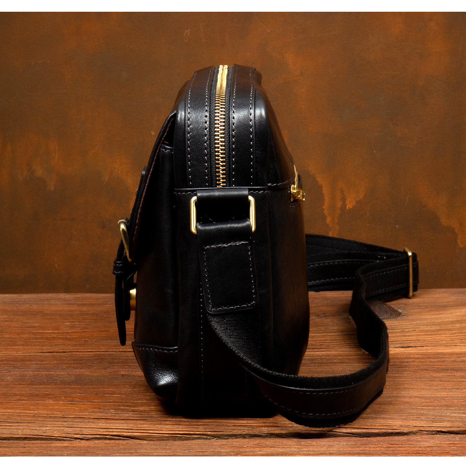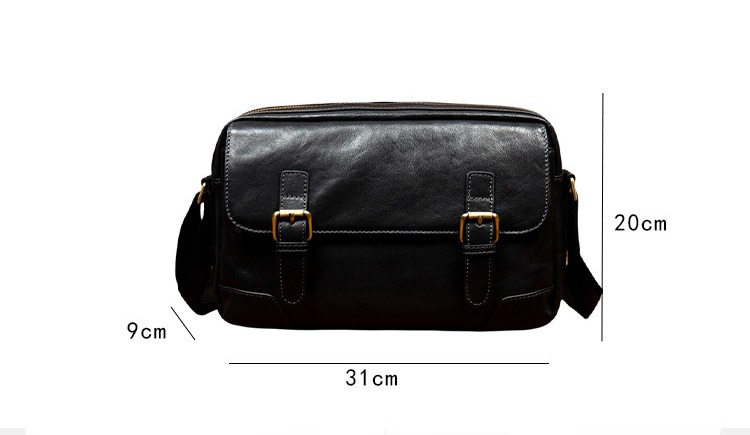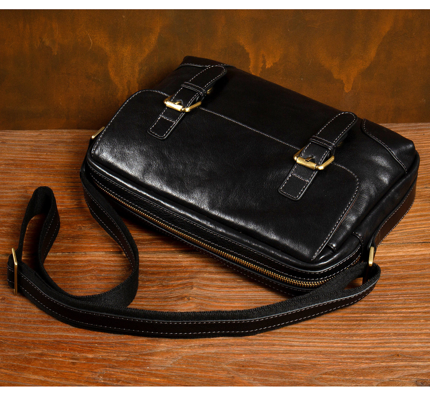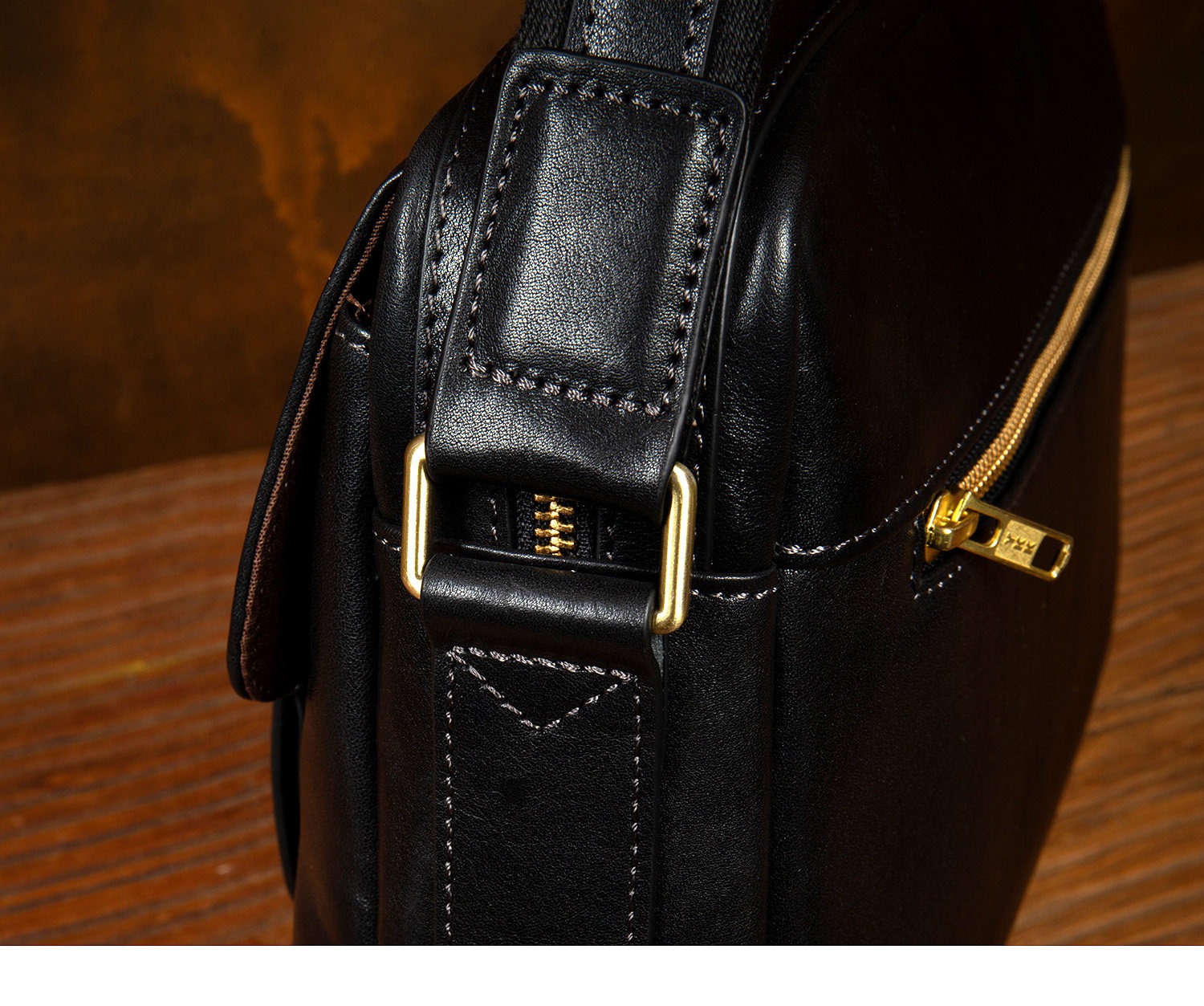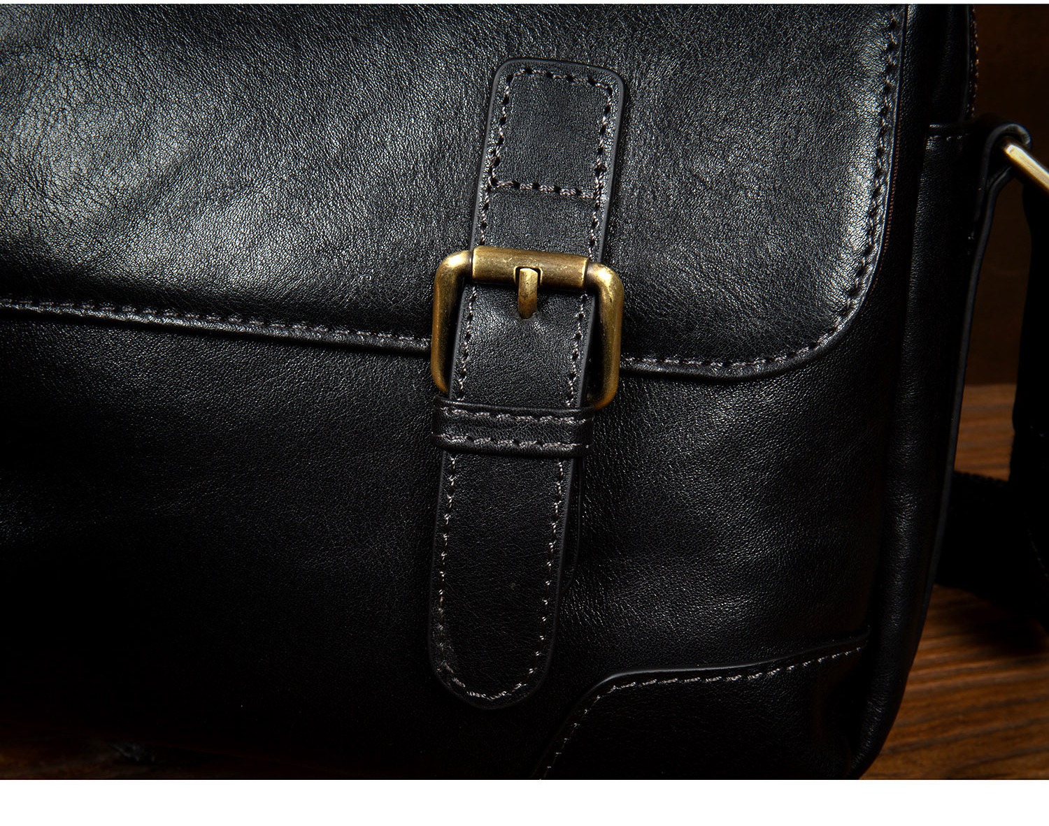 DEEPKEE 男士真皮高級感郵差包 黑色雙扣帶 休閒通勤單肩斜挎包 1368號