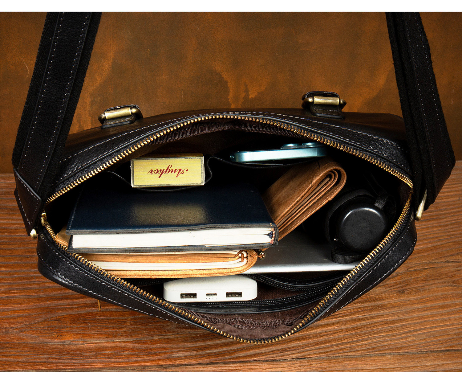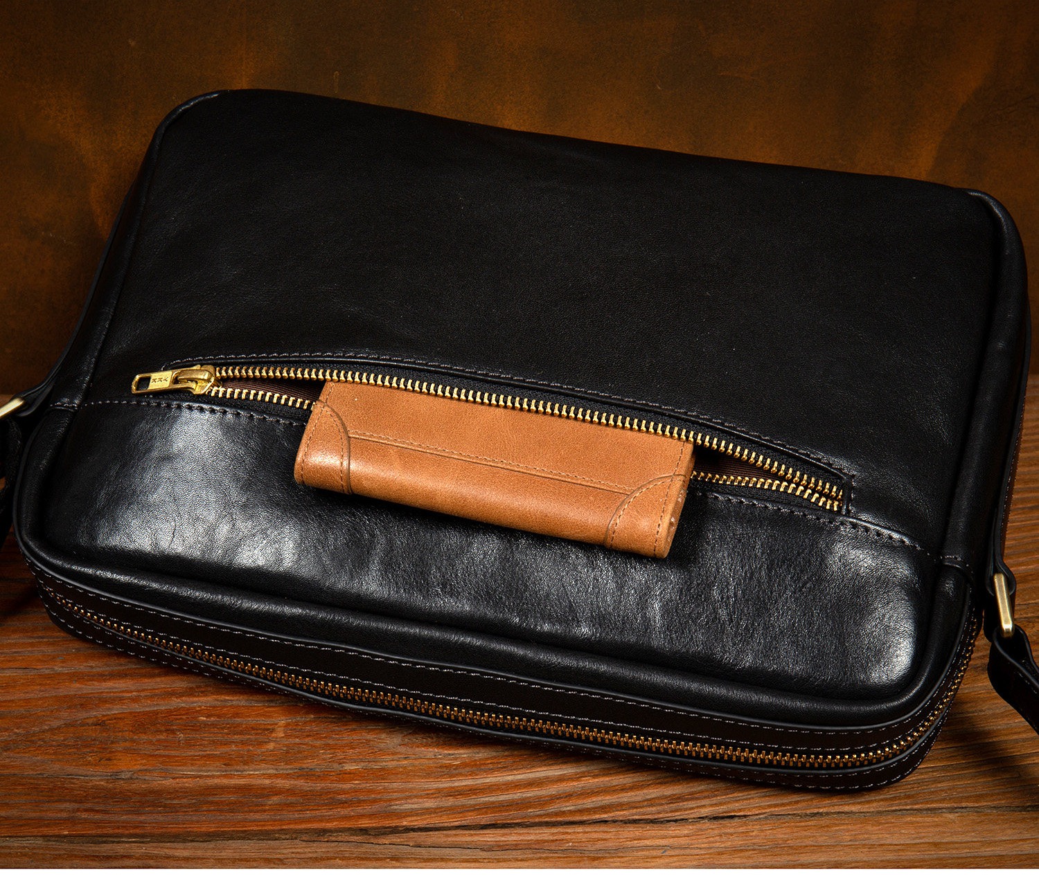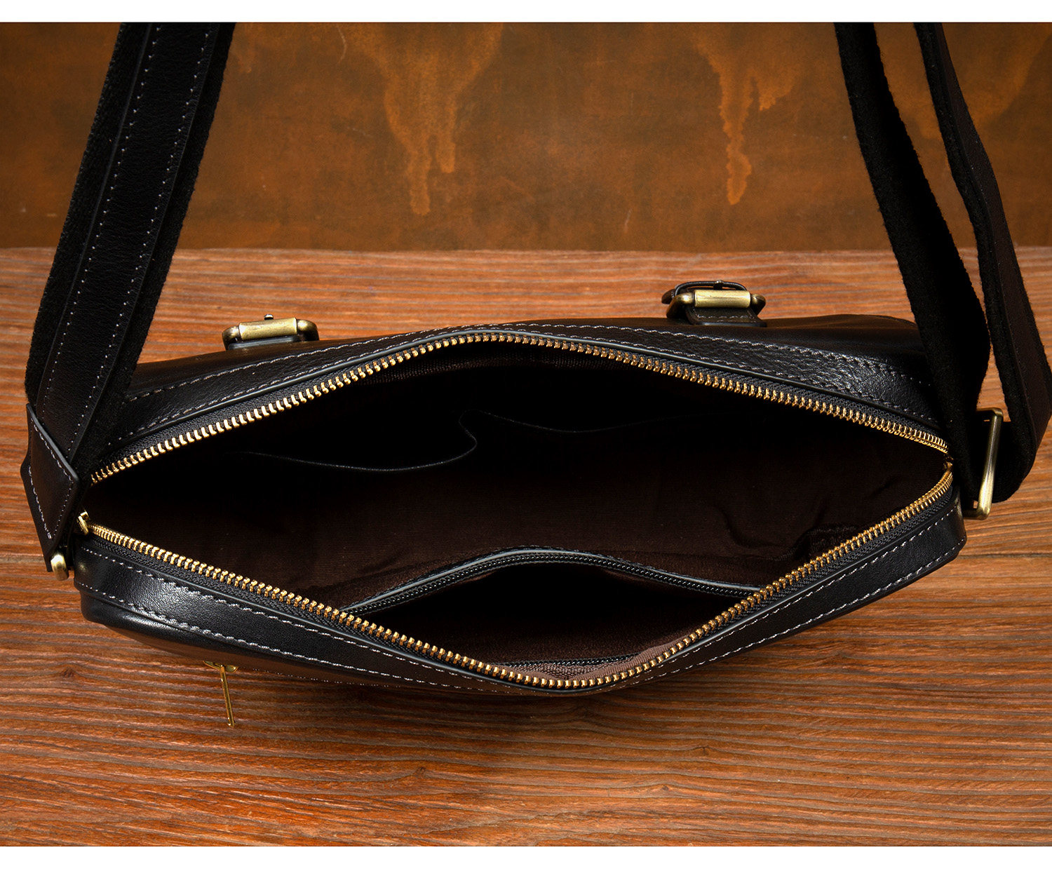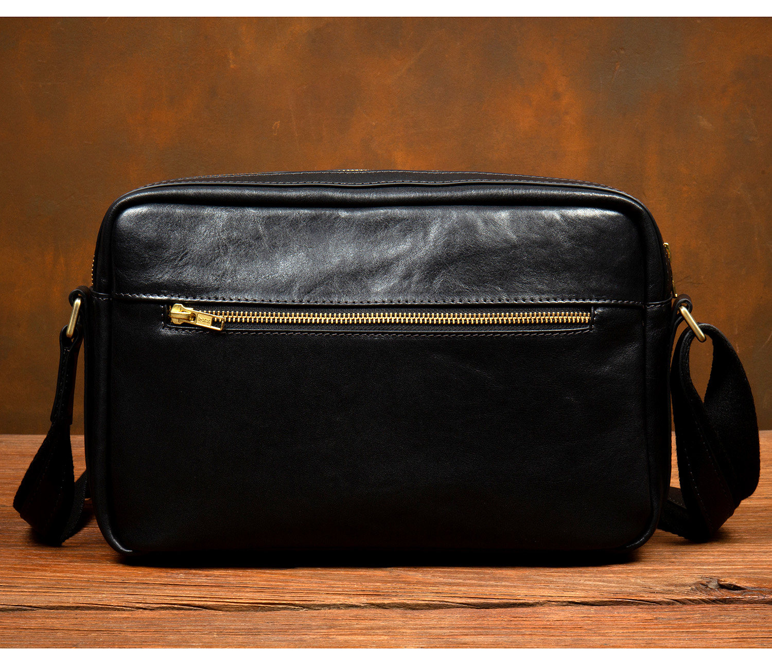 DEEPKEE 男士真皮高級感郵差包 黑色雙扣帶 休閒通勤單肩斜挎包 1368號
