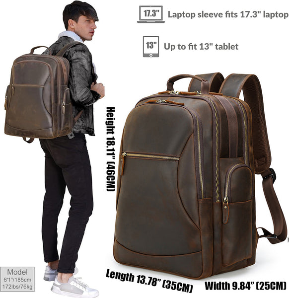 ▲Upgrade Comparison, (left)Dark Brown and (right)Dark Brown (PRO). Dark Brown (PRO) increase capacity by adding a zippered compartment on the back. Height 18.11” (46CM), Length 13.78” (35CM), Width 9.84” (25CM). Material is full-grain of Oil Impregnated Leathers, lining is polyester cotton, net weight about 2.5kg, shoulder strap: 60cm-100cm(adjustable), width 8cm, can be put into the 17-inch laptop, A4 folders, IPAD, magazines, books, cell phones, wallets and so on.