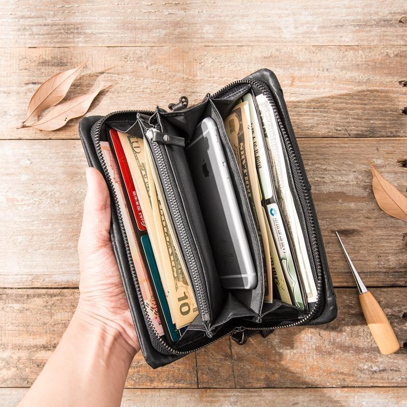 Cool Black Leather Men's Long Wallet Zipper Clutch Wallet Long Wallet Phone Bag Wristlet Wallet for Men